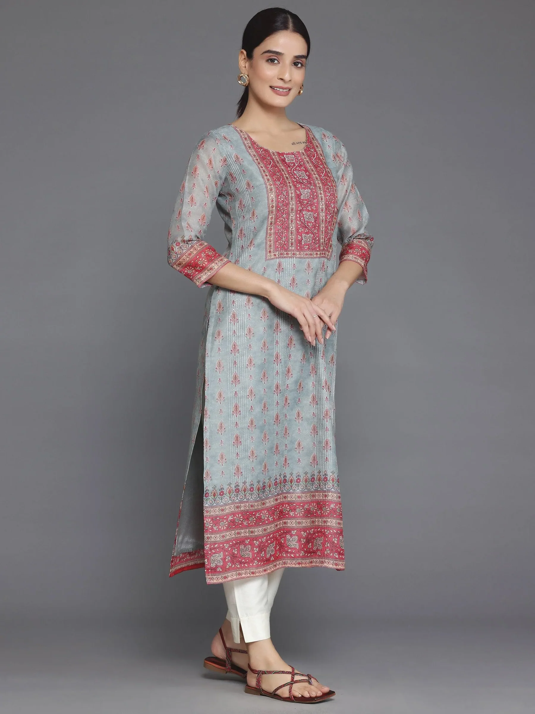 Grey Printed Chanderi Silk Straight Kurta
