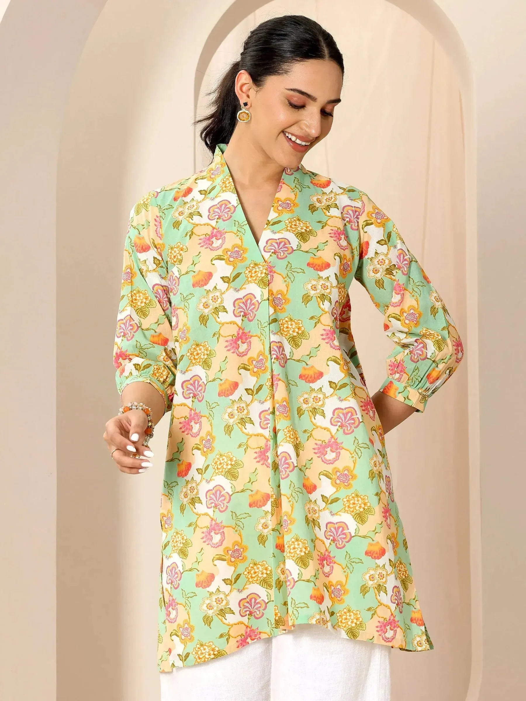 Green Printed Cotton Straight Short Kurti